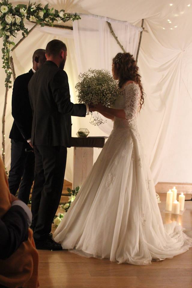 La robe de Emmanuelle est en Satin, tulle de soie et tulle polyester, dentelle de calais perlée et par dessus de la guipure rebrodée que Mademoiselle-Madame a incrusté par dessus.